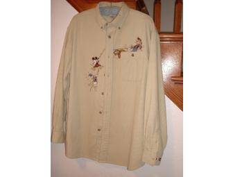 Unique, authentic Disney apparel...ladies "over sized" size medium corduroy shirt/jacket. It's a light beige color with the Disney characters Pluto, Donald, Mickey & Goofy embroidered across the front. It has the authentic Disney emblem on the back yoke. All buttons are brown/tan in color with "Disney" embossed on each one. There are two extra buttons sewn on the inside on the front. The front has one buttoned pocket.