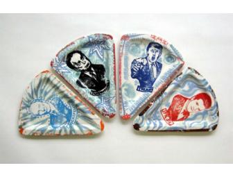 each plate set features images of "Men of New York City," including: John D Rockefeller, Mayor Michael Bloomberg, Donald Trump, and John F Kennedy Jr.
