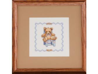 This 12 X 12 matted, glass framed, and cross-stitched bear in a chair would be a perfect piece of artwork for your home!