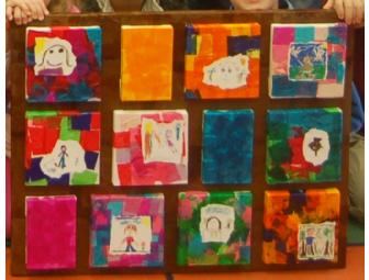 A collection of brilliant portraits of each child in room 104 found its way home this fall. In Ms. Fernandez’ class, each child is recognized as a special person by each of his or her classmates with a portrait that is then compiled into a book. After discussing what a portrait is, the 1st graders used Cray-pas to create their own image. Then, students chose three colors in various shades to decoupage their individual 6x6 canvas. The portraits were then placed on the beautifully vivid backgrounds. In the end, the individual works became two collective works of art! These pieces would be magical holiday gifts to purchase for your own child’s bedroom or playroom!