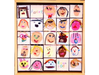 Description of Process: 1st Graders created 3 portraits of themselves: one with marker, one with collage materials, and one with a photo. These portraits were mounted on triangular block that spin on rows in a large shadowbox.