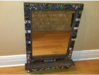 Description of Process: The 4th graders celebrated positive self-affirmations by embellishing mirror frames. They handmade individual mosaic pieces for mirrors by using one of two methods. They could either free draw illustrations on white and black tiles or they could find illustrations and decoupage them to the back of glass pieces, creating a magnifying effect. They accented their work using vintage buttons, beads, and jewels and then determined  the exact placement of each piece. They glued their self-designed pieces onto re-purposed mirrors using tile glue. The project was completed with tile grout. Voila! You won’t be able to look into these mirrors without thinking, “Look Out, World. Here I Come!”