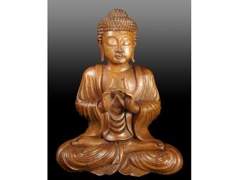 Bring the peace of Perfect Stillness into your home. Made of Balinese waru wood, this Buddha is sitting in standard cross-legged pose with hands in the teaching mudra. The warmth and richness of the wood was expertly captured by its handcrafter in Indonesia.