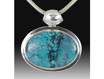 The pendant is handcrafted from sterling silver and natural Tibetan Turquoise.