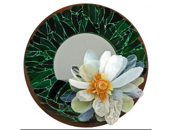 Assorted selection of hand-cut green stained glass for lotus leaf with mottled murky type dark- hued pieces to represent pond’s edge. Sand-grouted with blend of tints to create an effective accent hue on top of a copper framed, wood-backed mirror with metal hanging assembly and cushioned feet for table side use.