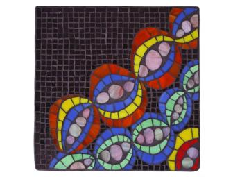 This piece is a representation of a Zentangle pattern. Using skillfully cut pieces of colorful stained glass with a brilliantly reflective background of purple mirror, this piece grabs attention with lots of movement with eye-pleasing color.