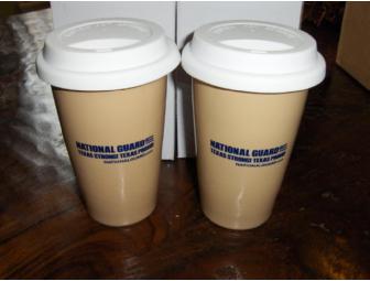 Set of Coffee/Tea Travel Tumblers with Silicone Lids - 12 oz. (TX Army National Guard). Tumblers look just like a paper cup from your favorite coffee shop! Choose this reusable, environmentally friendly option instead. Approximate 12 oz. capacity. Silicone drink-through lid. Dishwasher safe.