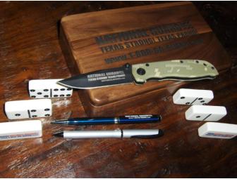 TX National Guard imprinted Dominoes in dark wood box. National Guard 4" Linerlock Knife (ACU print). Blue National Guard lazer pointer pen (metal with blue lazer). Metal dual purpose National Guard pen with flashlight and green lazer pointer.
