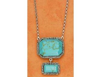 - smaller rectangular stone hangs from a larger octagonal turquoise stone
