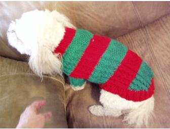 A Bichon Christmas sweater! Sporting red and green hearts and cables, this hand-knit sweater is designed for a chilly walk in December (but can be used anytime a fluff needs to ward off the cold). It’s made of washable acrylic yarn and has an opening to attach a leash to a harness worn underneath. Modeled here by my silly boy Scottie, this pullover sweater is made to fit a 10-15 lb. Bichon.