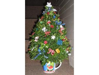 Holiday Decorated Boxwood Tree, made of fresh boxwood branches placed in oasis (foam) in the shape of a tree. The picture is an example of one made in a holiday mug and stands approximately 16" high and decorated with small ornaments, ribbons, silk flowers and holiday accents. It will stay green thru the holidays, and perfect for small apartments, nursing homes, offices, etc. Also makes a great gift ! My donation will be made fresh for the Auction.