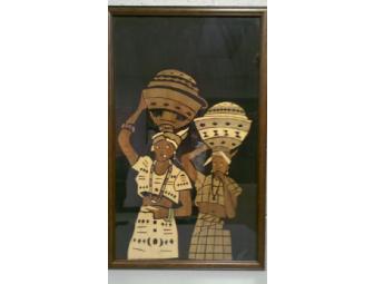 Beautiful Nigerian art of two females. A locally framed piece created from wood shavings on black silk.