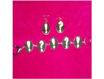 This funky jewelry set has been "upcycled" from recycled bottle caps and polymer clay, and the exclamation points and question marks glow in the dark! =]