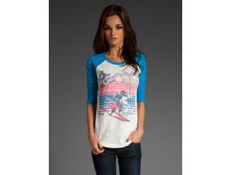 Junk Food Clothing's "Mickey's Ski Patrol" Women's raglan long sleeve.  Creamy white with blue sleeves.  Cotton/poly blend.  Women's size large.