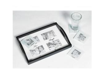 Espresso-finished bed tray features four 3.5" x 5" photo openings & the sentiments "Live, Laugh, Love, Imagine". Each frosted sentiment coaster holds a 2.5" x 2.5" photo. Makes a memorable gift!