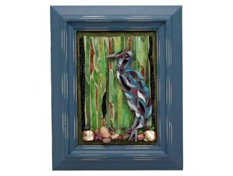Media: Stained glass, smalti, gold leaf, glass beads, pebbles on glass. “Blue Heron” may be displayed with or without frame backing for two distinctly different effects.
