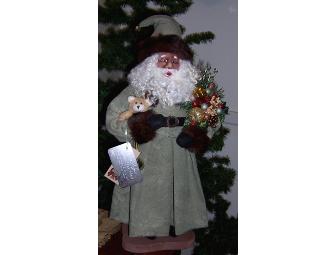 Original "Victorian" Santa dressed in Sage green trimmed with dark fur (recycled). A gentle Santa carrying Christmas decorations and a teddy bear.