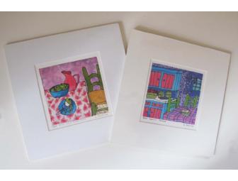 "Gram's Hoosier" and "Pink Jug & Green Chair" A pair of limited edition signed prints by Brattleboro silk artist Linda Marcille. Each print depicts a whimsical interior scene and was created from one of Linda's original paintings on silk. The prints are mounted, matted and shrink-wrapped.