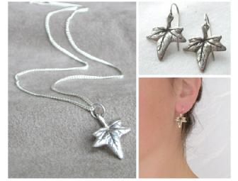 Set of hand carved and cast sterling silver necklace (on 18" chain) and matching earrings. Set features an ivy leaf design.