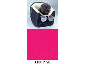 Snoozer Lookout dog car seat in hot pink pleather has faux lambswool interior and includes a safety tether strap which attaches to your dog's car harness and loops around your car's seat belt strap. The cover can be removed for machine washing (line dry). Holds Up to 18 lbs. - 15" W x 19" D x 17" H (water/food dishes not included).