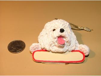Won't they be surprised to find this on the tree or attached to a gift! Bichon head with it's arms holding a "sign area" - you can add someone's name or your pet's name with a red permanent marker. You can hang it up or put another ribbon thru the eye on top to place elsewhere.