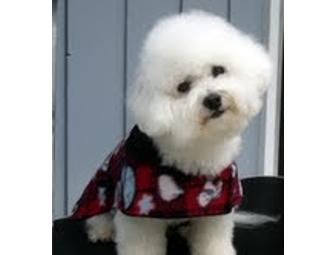 Awesome doggie coat.  Hand made with high quality fleece and fully lined with high quality fleece!  Red and black plaid with white polar bears wearing scarves and blue snow flakes.  Size large for doggie 16 pounds or larger.  Attaches around neck and under belly with vicro.  Measures 16" by 14"