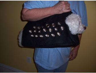 Bag is 17" x 10" x 6" with an attached hook for securing the dog inside. Has a 6" inside pocket.