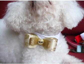 Cameo is ready for Christmas wearing this gold bow sewn onto a 2" stretchy band. Band slips easily over the head of your pup and is not tight or binding.