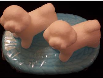 Two white Bichons on a light blue braided rug. Hand made glycerin hand soap by The Creature Coalition. Use as a guest bathroom display, or use for everyday washing your hands.