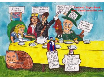 This print is based on my original ink and watercolor parody of both "Alice in Wonderland" and the Tea Party movement. Alice sits in a chair while she's surrounded by Michelle Bachmann as the Queen of Hearts, Sarah Palin holding the White Rabbit that she shot, Glenn Beck as the Mad Hatter, and Rush Limbaugh as the Cheshire Cat. Rounding out the insane party are signs based on real signs photographed at actual Tea Party protests.
