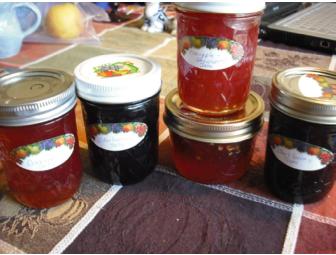 1/2 pint jars of homemade jam and jelly including hot pepper, elderberry, crabapple, blackberry, pineapple-strawberry.