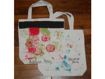 Description of Process:  Kindergartners painted 12 fabric bags, 2 are pictured here.
