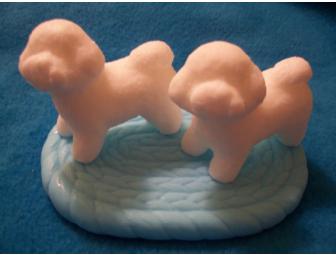 Glycerin Soap Bichons on a rag rug. The bichons are white, rug is light aqua.