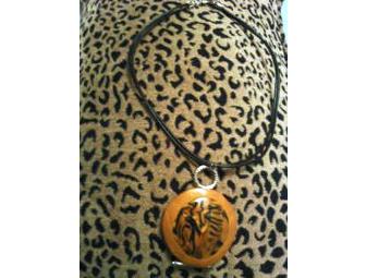 Stunning Animal Print Pendant. Hanging on a double strand of black leathr cording. Pendant is 2" in diameter. Some silver for detailing including nice large clasp.