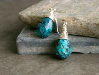 Richly-veined, genuine turquoise teardrops, wrapped in coils of sterling silver.
