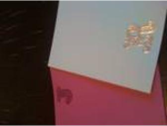 One set of hand monogrammed cards (10 cards in a set). Choose from purple, red, ice blue or chartreuse paper. Your initial will be on the top or bottom of the card in either silver or clear (it will show up as a darker shade of the paper color). Envelopes included.