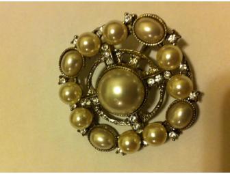 Costume jewelry brooch, metallic with pearls and cubic zirconium, about 1-1/2" wide.