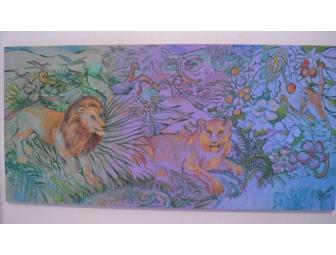This painting, acrylic on canvas, shows a verdant jungle scene populated by a variety of animals at peace. Painted by the donor Theresa Reuter in 2006, it is 30-1/2" wide and 16" high.