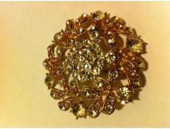 Costume jewelry brooch, gold encrusted with cubic zirconium, about 1-1/2" wide