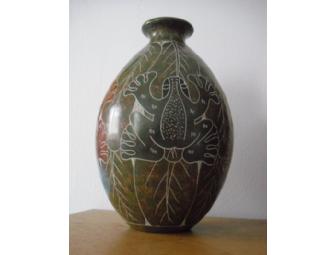 Nicaraguan pottery vase, etched & painted, with frogs & leaves