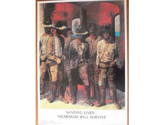 Poster reproduction of a painting by internationally renowned Nicaraguan artist Armando Morales, signed by the artist. The picture is of Augusto Cesar Sandino, the Nicaraguan hero, and his officers. Original painting was created in 1985; the posters, in 1986, to commemorate the 25th anniversary of the FSLN. Poster is 25" high and 17-1/2" wide.