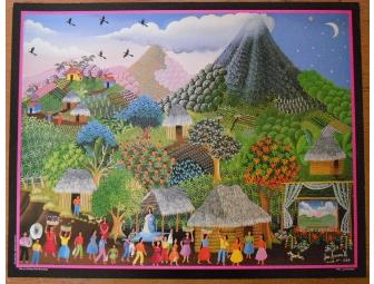 Poster reproduction of a 1987 painting by Luis Alvarado of Masaya, Nicaragua. The artist has had solo exhibitions in Managua and several Japanese cities. The picture represents "La Griteria" (The Shouting), a boisterous and celebratory festival held on December 7th, the final day of a nine-day period, La Purisima, honoring the Virgin Mary. As fireworks explode around them, Nicaraguans "shout" to the virgin, and they walk the streets to visit their neighbors and exchange gifts. The poster is 25" wide and 19-1/4" high.