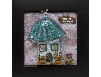 I was a stained glass artist before mosaics captured my attention and became my passion. Fun and whimsical, “Room for Rent” is a 3-Dimensional multi-media mosaic. It’s the first in a series of what I call, “Emergent Mosaics”, where a focal point emerges from the background.