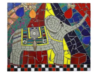 Media: Stained glass, glass tile, seed beads, glass beads, iridescent glass & beads, reclaimed jewelry pieces, clay tile, and millefiori. I have also used a ‘found’ piece of shell for the elephant’s ear.