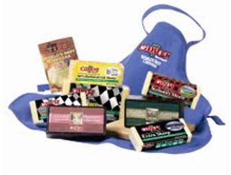 "From Vermont, you get an extraordinary variety of cheeses. With this gift box of seven amazing cheddar cheeses, you also receive a cheese slicing board and an embroidered apron. You will never run out of cheese."