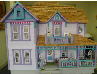 This doll house is meticulously decorated with no detail unnoticed, a different color scheme for each of seven rooms, all with wall paper, carpeting, window treatments, furniture, accessories and pets!. Rooms include kitchen, living room, bedroom, play room, bathroom, attic and music room. It is a two story, shingled and brightly painted house with a wrap around front porch and upstairs balcony. The signature of the mother and daughter team who created it is a mouse in the living room, see if you can find it!