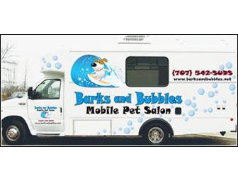 "Barks and Bubbles Mobile Pet Salon arrives at your home, walks or carries your pet into the salon, where a quiet setting, warm bath, and personalized attention by a professional pet stylist awaits."