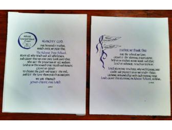 "Imagine owning this one-of-a-kind offering of two beautiful pages of calligraphy featuring the Advent Alma Mater and The Advent Day School Prayer. These pieces are hand done in absolutely astounding calligraphy with stunning illustrations. Because almost everything is now done on computers, this is a very rare piece indeed. This writing illustrates the glory of God. As the Alma Mater truly states, “Father, we thank thee for the school we love.”
