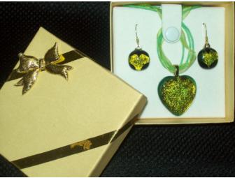 Exquisite heart pendant with matching pierced earrings in Dichroic glass. A gold setting with green reflective hearts on all three pieces.