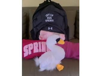 Girls Under Armour backpack as well as a t-shirt, hoodie and zip fleece all adorned with the Indian Springs logo. A stuffed animal swan completes the package!